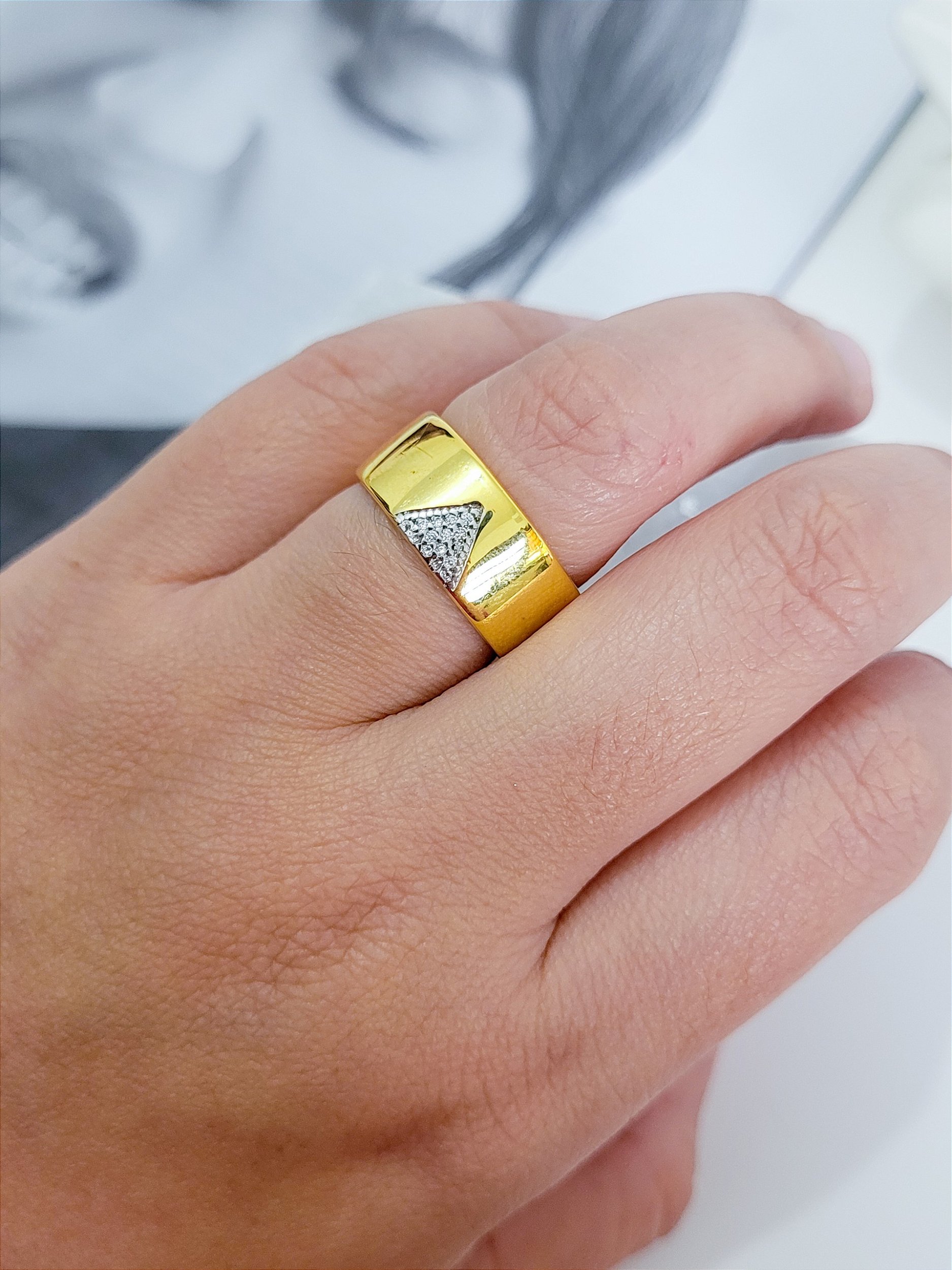 Anel Grosso com Detalhe Central, uma peça moderna e cheia de estilo que se destaca pelo seu design imponente. Com banho de ouro amarelo e detalhe central com cravação de zircônias, ele reflete elegância e brilho na medida certa.