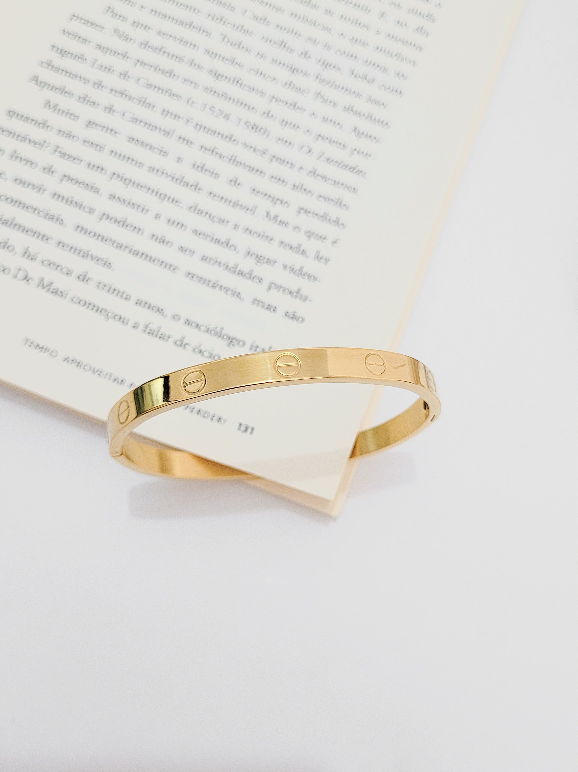 Bracelete Liso com Detalhes, uma peça que une elegância e versatilidade em um design atemporal. Com acabamento polido e sutis detalhes que realçam seu brilho, é perfeito para ser usado sozinho ou em mix com outras pulseiras e rivieras. Seu formato fechado garante um visual sofisticado e moderno, ideal para quem busca um acessório marcante e fácil de combinar.