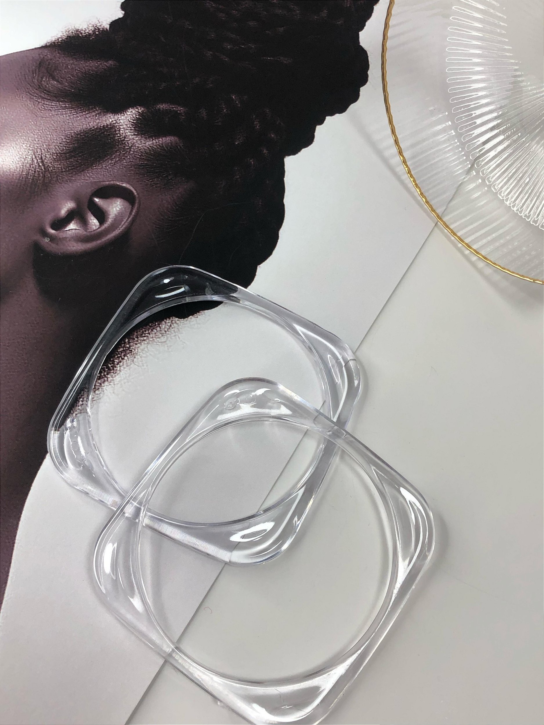 Bracelete Quadrado em Acrílico Transparente, uma peça que une modernidade e sofisticação em um design único. Com seu formato geométrico e acabamento clean, este bracelete é perfeito para quem busca um acessório estiloso e leve, ideal para compor looks despojados ou elegantes com um toque contemporâneo.