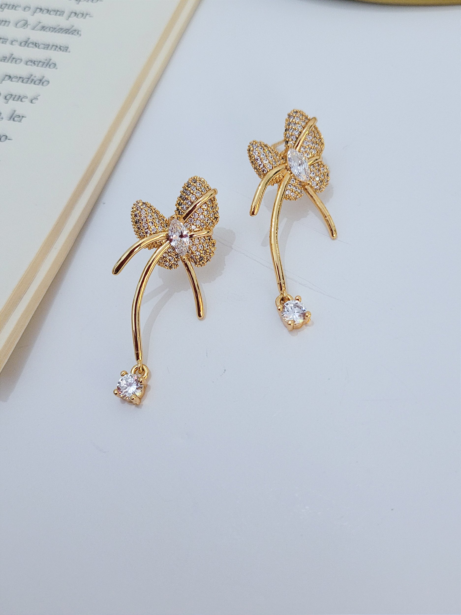 Brinco Laço Cravejado, uma peça delicada e cheia de brilho que transforma qualquer produção. Com design alongado em formato de laço, inteiramente cravejado com zircônias e finalizado com um ponto de luz, ele traz elegância, feminilidade e um toque sofisticado ao look. Perfeito para quem ama acessórios marcantes, mas ainda assim delicados.