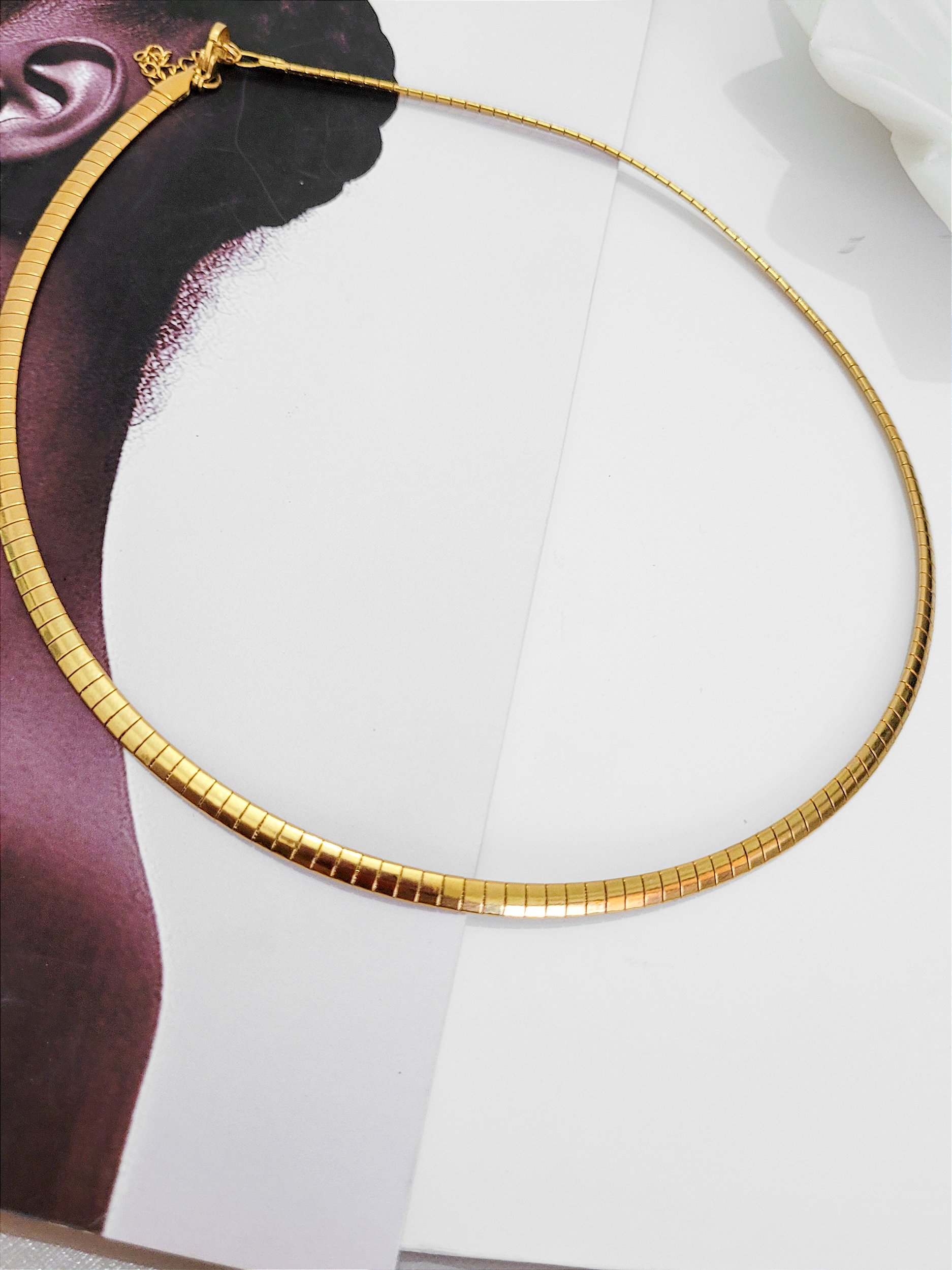 Por ser um aro rígido, ele se acomoda perfeitamente no pescoço, oferecendo praticidade, conforto e um visual impecável — ideal para quem busca uma peça marcante e estilosa para elevar qualquer look.