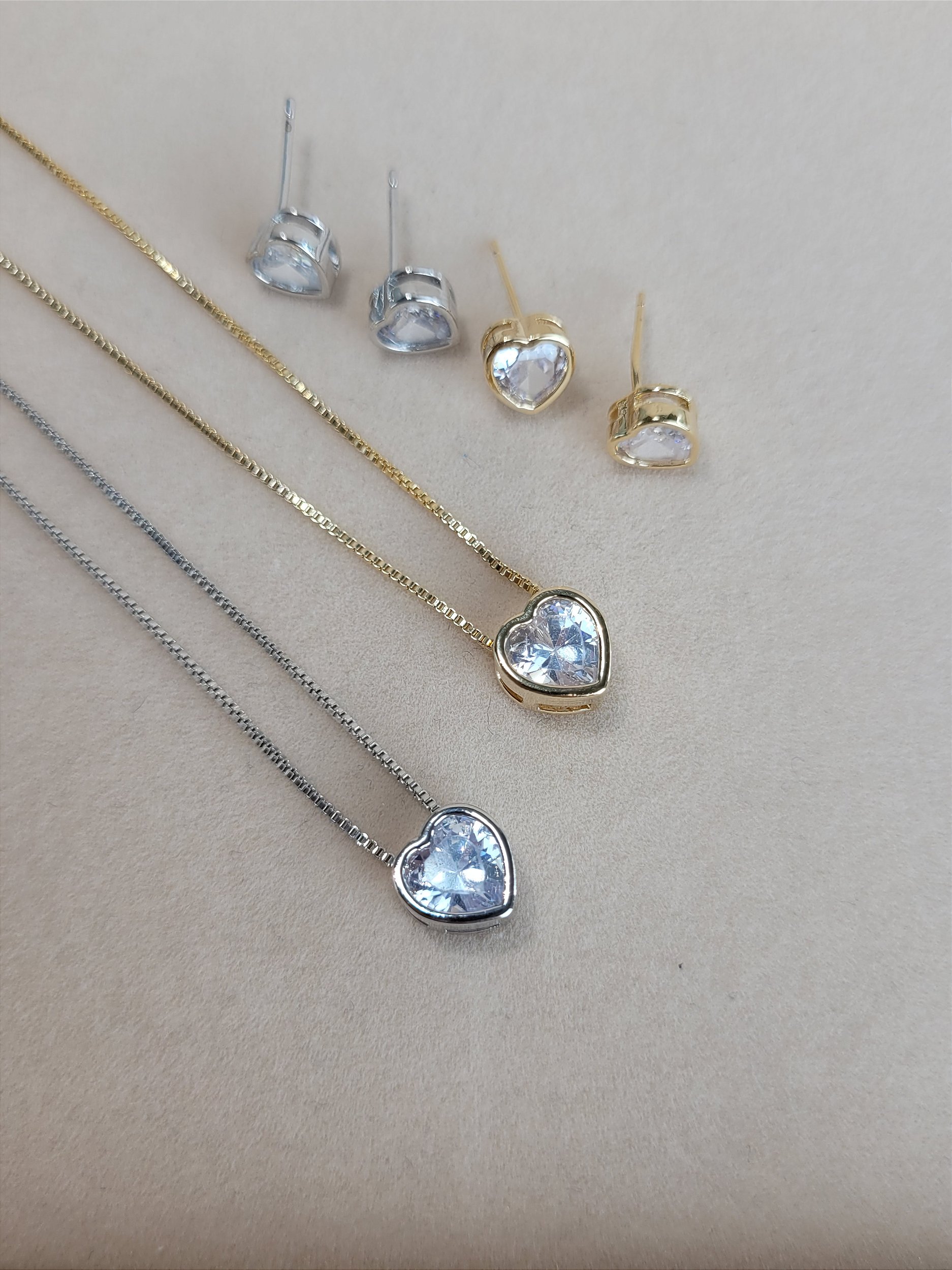 Encante-se com a suavidade e a beleza do nosso conjunto em formato de coração, cravejado com pedra zircônia. Com colar veneziana de 45 cm e brincos especialmente desenhados para disfarçar orelhas rasgadas, este conjunto é a escolha ideal para um visual sofisticado e delicado.